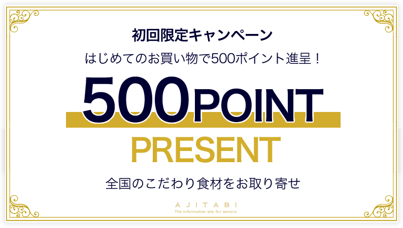 あじたびは日本全国からこだわりの逸品だけを集めたお取り寄せサイトです。 全国各地で受け継がれる技と情熱。選りすぐりの生産者が手がけた、日本の食文化の奥深さと感動をお届けいたします。 ただいま、初めてご購入いただいたお客様全員に500ポイント(500円分)をプレゼント。