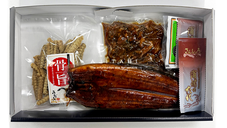 | 内容量 | 蒲焼き1人前(110g)、山椒、蒲焼きタレ、吸い物、うなぎ肝焼き100g、うなぎの中骨唐揚げ30g |