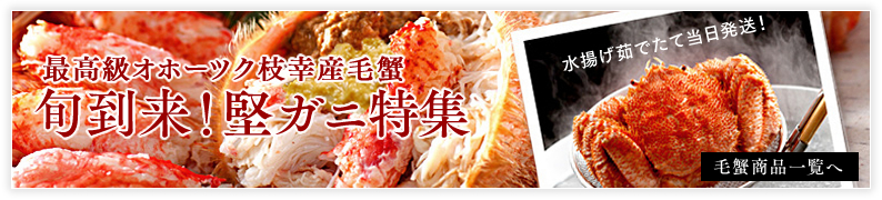 当店からお届けする毛がには、全て日本一の水揚げ量を誇るカニの本場「枝幸産」。その中でも、枝幸の毛がにを扱って50年の産地仲買人が吟味した、身入りたっぷりの堅ガニだけ。