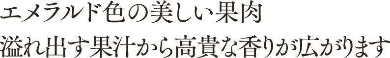 エメラルド色に輝く美しい果肉を、スプーンですくっていただけば、ジュワ~っととろける食感と、上品な甘みが口中に広がり、かぐわしい香りが鼻を抜けていきます。